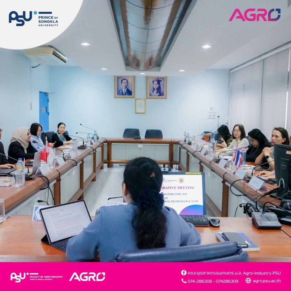 คณบดีคณะอุตสาหกรรมเกษตร ม.อ. (ผศ.ดร. เสาวคนธ์ วัฒนจันทร์) พร้อมด้วยทีมบริหาร อาจารย์สาขาวิชาเทคโนโลยีและการจัดการอุตสาหกรรมอาหาร และงานวิเทศสัมพันธ์ ให้การต้อนรับผู้แทนอาจารย์จาก Department of Agro-Industrial Technology, Faculty of Agricultural Technology, Universitas Gadjah Mada (UGM), Indonesia ในโอกาสมาเยือนคณะอุตสาหกรรมเกษตร ม.อ. ภายใต้บันทึกข้อตกลงความร่วมมือทางวิชาการ ช่วงเช้า การประชุมหารือความร่วมมือทางวิชาการด้านการแลกเปลี่ยนนักศึกษา และหลักสูตรทางด้าน Agro-Industrial Technology ณ ห้องประชุม 1 คณะอุตสาหกรรมเกษตร